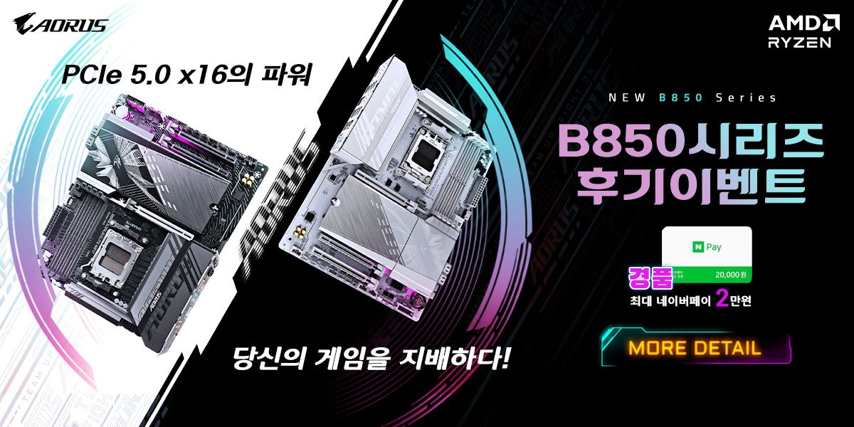 AORUS 공식 홈페이지에서 B850 시리즈 구매 후기 이벤트에 참여하면 네이버페이 포인트 2만 원을 추가로 받을 수 있습니다. 등록 과정이 다소 번거롭긴 하지만, 2만 원 캐시백은 충분히 도전해볼 가치가 있습니다.