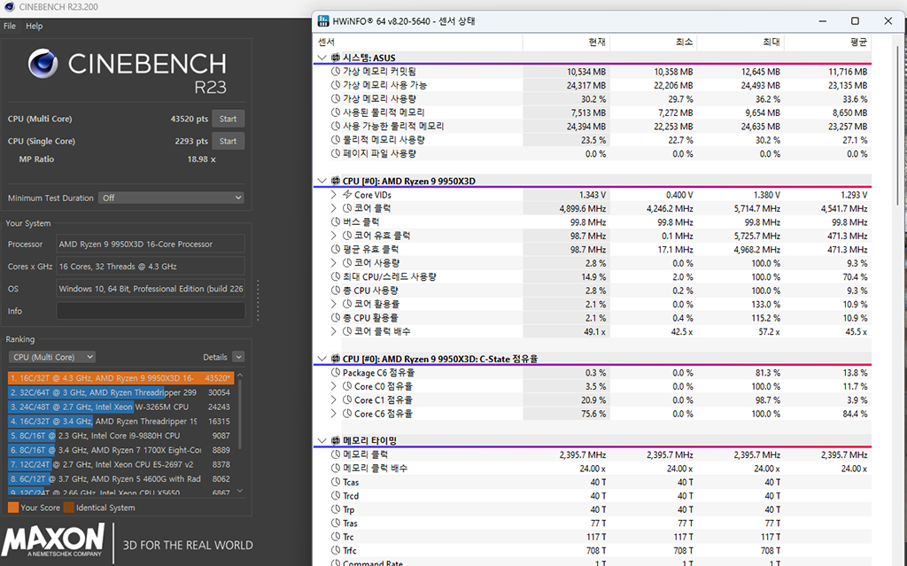 특히 게임 환경에서는 시네벤치의 멀티코어 점수가 철저하게 무의미해지는 경우가 많습니다. 게임 엔진은 수십 개의 코어를 골고루 활용하기보다는, 소수의 핵심 코어와 메모리 간의 통신 지연 시간(Latency)에 훨씬 더 민감하게 반응하기 때문입니다.